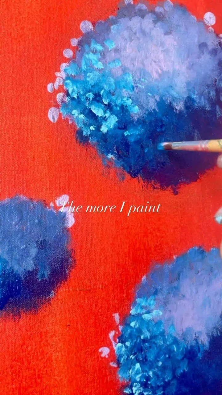 My art features lush, bold botanical shapes full of life, lively brushstrokes and textures that create depth, a mix of organic and geometric forms for balance, and a playful yet sophisticated range of colors combining bright tones with soft pastels.